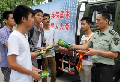 6月27日,人武部工作人员正在北门中学给学生现场解答提问,并开始接受参军报名。近日来,荆州市荆州区征兵工作人员走进部分学校和社区,向刚刚毕业的高中学生宣传2013年的征兵政策,发放征兵宣传资料。据介绍,从今年起,全国征兵时间由冬季改为夏季,这是自1990年国家实行冬季征兵以来首次调整征兵时间。 (记者 杨平 本报视界网 白煊 摄)
