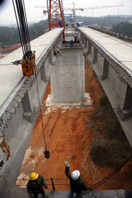 汉宜高速铁路抓紧施工2010年3月2日拍摄,铁路建设者在汉宜高速铁路跨荆宜高速公路特大桥架梁施工。汉宜高速铁路是我国”四纵四横”铁路主干网络中的沪汉蓉高速客运专线的一部分,为国家一级双线电气化铁路,总投资200亿元,正线全长293.1公里。东起汉口站,西接长江三峡宜昌。目前,汉宜高速铁路全线展开铺轨,出宜昌东站铺轨完成20多公里,该铁路2008年9月8日动工,将于2011年底全部竣工,届时坐火车宜昌至武汉2小时即可到达。文振效