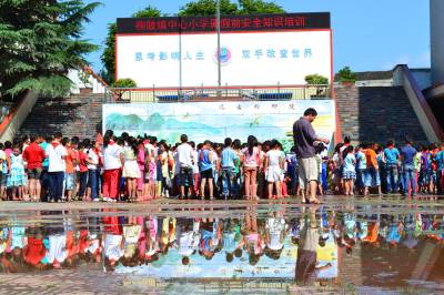 6月27日,湖北省郧县柳陂镇中心小学不顾雨后场地积水湿滑对学生进行暑假前安全知识再培训。