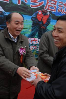 3月2日,鄂东的武穴市咋暖还寒,可在位于该市的大金镇的武穴市海鲲水产品加工有限公司内外,到处洋溢在一片热烈、火热的气氛之中,火红的气球,巨幅红色标语,在巨大的红色主席台上,一排醒目的的大字告诉人们一个特大的喜讯:2010年全省渔业科技入户暨水产品质量安全科普下乡启动仪式在武穴举行。省水利厅党组成员、省水产局局长徐汉涛,省水产局副局长郑国蓉,省水产局副巡视员、总工程师祝细汉,省水产技术推广中心主任马达文,中国水科学研究院长江水产研究所研究员曾令兵,华中农业大学水产学院教授龚世园,黄冈市副市长李安宁以及黄冈市水产局、武穴市四大家领导出席了启动仪式。在启动仪式上,来自湖北省水产局、各科研单位、大专院校、黄冈市水产局的专家学者现场为渔民解答各种疑难问题,重点对他们进行技术指导。武汉合缘绿色生物工程公司、深圳市希科安实业有限公司等单位还为该市水产行业协会免费赠送了渔需物资。图5,图6:在启动仪式上,附近十镇八村的养鱼专业户积极找寻自己急需的技术资料。图4:省水利厅党组成员、省水产局局长徐汉涛(左)等领导向武穴市养鱼专业户代表赠送了科技资料。湖北省武穴市委冯怡红摄影报道