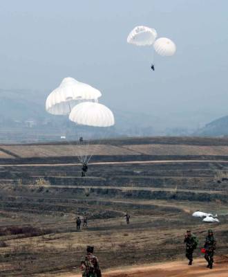 ”嘀—嘀—”,绿色的信号灯开始闪亮,飞机进入预定空域,800米高度,跳伞开始,”跳——”投放员手一挥,第一名跳伞员眨眼间不见了,伞兵批次空降,一时间,朵朵纯洁的伞花绽放在祖国蓝天,犹如神兵天降,3分钟后,新战士们成功着陆,脸上露出了灿烂的笑容。2月27日,笔者来到大别山腹地某军用机场,用镜头记录驻随空降兵某部五百余名新兵虎年首次示范跳伞取得圆满成功的精彩瞬间。当日上午,”红色伞兵”某军用机场,战旗猎猎、军号嘹亮,数架运输机编队起飞,把数百名空降兵战斗员投向预定”战场”。数百名官兵整齐列队,整装待发,勇往直前,迎接新年度首次空降考核,新战士们摩拳擦掌,虎气冲天。平日里,他们冒严寒,顶酷暑,在训练场上挥汗如雨,高难度标准下锤炼;在高强度任务中砺练,提高了空降兵战斗员的基本技能,练就空降兵独有的钢臂铁腿。为了这一刻的绽放,空降兵们毫无惧色的勇气在祖国蓝天翱翔。本报视界网孙清军杨文明摄影报道电话:13872860263