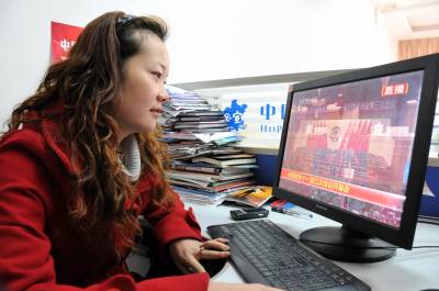 本报视界网:田丹3月3日下午,宣恩县新闻中心职工正在网上观看政协第十一届全国委员会第三次会议开幕式直播实况。全国”两会”召开之际,该县干部群众通过报纸、电视、网络积极收看”两会”实况,及时了解和领会”两会”最新动态。