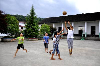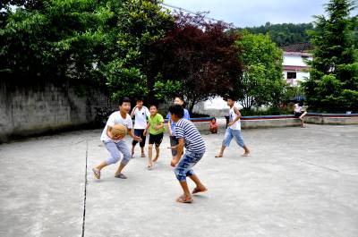 7月10日,在湖北恩施市红土乡平锦村文化广场上,几名孩子在蓝球上练球。