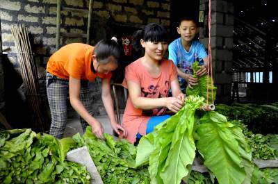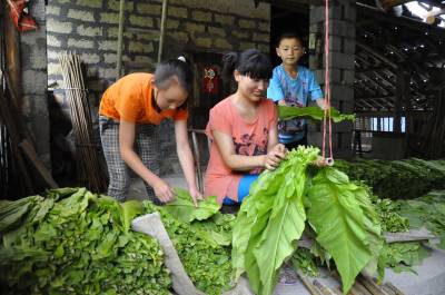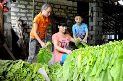 7月10日,在湖北恩施市红土乡大岩村龙洞湾组,几名孩子正在帮大人上烟叶。