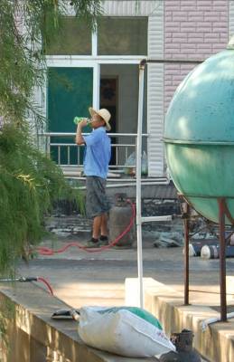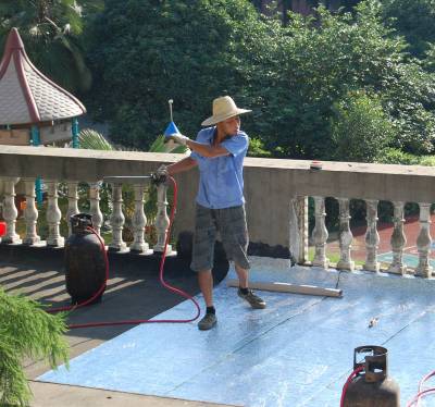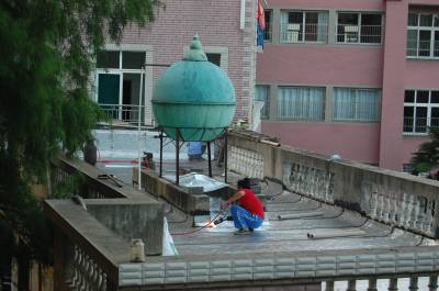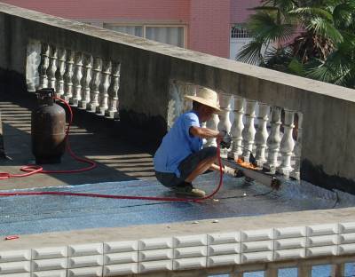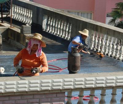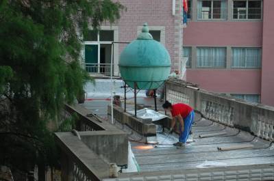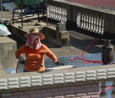 7月11日,一对来自安徽农村的农民工夫妇冒着40多度高温,拿着燃气喷火枪,顶着烈日骄阳在云梦县实验幼儿园屋顶铺设油毡层防水补漏。当日,云梦县最高温度达到35摄氏度,烈日下的屋顶达到了40多度,农民工夫妇衣服被汗水湿透。视界网 陈保忠 摄