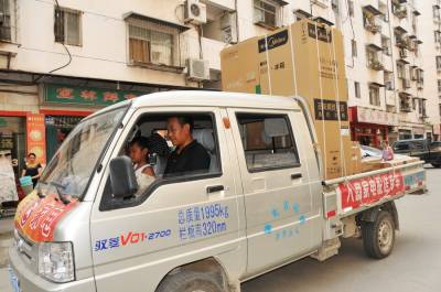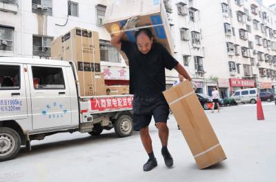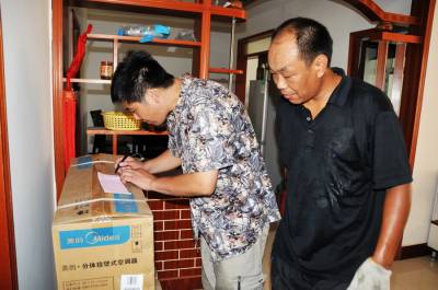 12日笔者在郧县人民商场看到前来选购空调的客户挤满在样品前,付钱下单流水线进行,仓库内的三辆运货车轮流出货,按照发货单送到客户家里让客户验收签字。今年38岁的艾华师傅开着一辆北京福田双排座货车在仓库里上货捆扎,今天第一家客户在郧阳花园A区2号楼2层,送货车来到楼下他让放署假跟着他的儿子看车,他拿出送货单核对型号和品牌后肩上扛着主机左手提着挂机送到客户家里,客户核实验收后在发货单上签下自已的名子,艾华师傅每天就是这样在高温下装车,开车,送货上门,每天需跑5---9趟,衣服从没有干过。