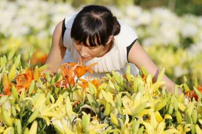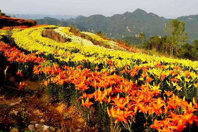7月12日下午18时,三峡夷陵百合花在夕阳光下五颜六色更是争艳夺目,一片金黄色山区田园风光更加迷人,引来不少观花游人。