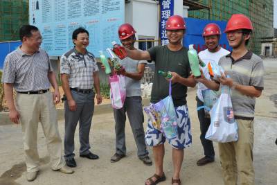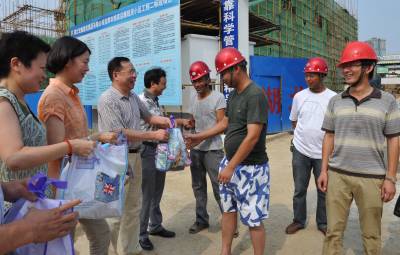 清凉送到工地上 7月15日,湖北宜都市总工会的干部在建筑工地向建筑工人送“清凉礼包”。当天,宜都市总工会开展送清凉活动,将价值3万多元装有清凉油、花露水、酸梅汤等防暑降温用品的300多个清凉礼包送到了车间、执勤交警、环卫工人和建筑工地的工人手中,并组织动员全市各乡镇开展向一线工人送清凉活动。 湖北省宜都市委宣传部:曹礼达摄 电话:13872539969 邮编:443300