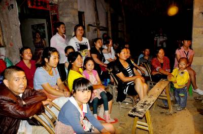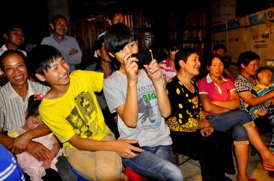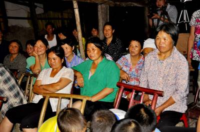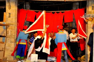 7月15日晚,在湖北恩施市红土乡红土溪村,综合文化站工作人员正在一家农户录制傩戏《姜女下池》剧情。