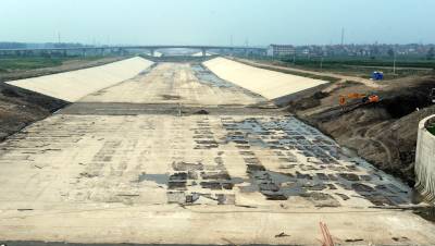 大型卡车往返穿梭,挖掘机正将渠道向前节节推进,荆州李埠引江济汉施工现场一遍繁忙。据介绍,这项工程引水干渠全长67.23公里,渠底宽60米,设计水深5.62~5.85米。2010年3月开始分段开挖,截止7月15日,除部分道路桥梁交汇点之外,基本完成土方开挖施工,全线渠段形成,渠道衬砌混凝土浇筑等硬化处理也已完成工程量的83%,年底前可望全部完成。 图1:长江入口处渠道挖掘施工现场。 图2:经过防渗、衬砌等硬化处理的渠道。 (记者 杨平 摄)
