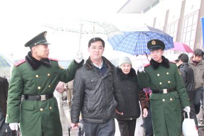 > 武警某部春运执勤官兵主动给旅客遮风挡雨