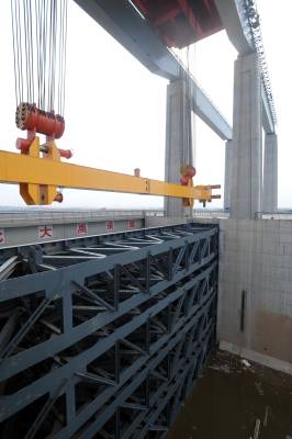 17日,重达680吨的金属闸门分为4个节段落于闸室,闸门关闭,荆江大堤防洪闸主体工程建设全部完成,开始具备挡水功能,为引江济汉长江防洪提供安全保障。据介绍,该闸位于荆州市荆州区李埠镇荆江大堤后侧,为开敞式平底闸,闸室顺流向长35米,结构总宽84米,闸顶高程45.6米,共设2孔闸口,单孔净宽32米,净空8.5米,具备1000吨级船舶通航能力。 (记者 杨平 摄)