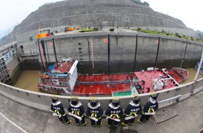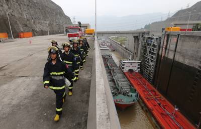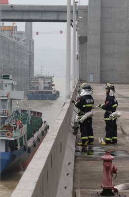 消防官兵守护万吨危化品船舶安全通过三峡五级船闸(方佩 摄)