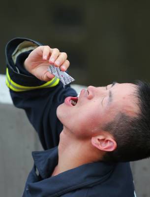 当日12时,三峡船闸北二闸室地面温度高达46摄氏度,战士们却穿着含有阻燃材料的夹层的战斗服,佩戴救生绳、消防斧等11件个人防护装备,一丝不苟地护卫着船舶过闸,直到这些危化品船舶安全驶出船闸,官兵们才送了一口气。