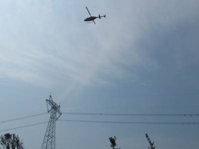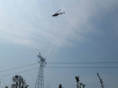 飞机巡线保安全 18日,直升飞机对沙洋县沈集段的高压线路进行巡检,保障夏季用电安全。 (本报视界网舒兵、刘明华摄)