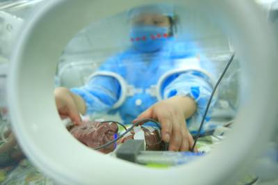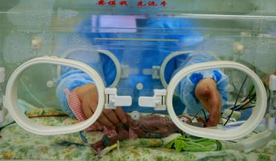 3月5日,湖北民族学院附属医院的护士护理”袖珍宝宝”。2月24日,湖北省恩施市一名24岁的孕妇早产下一名仅670克重的”袖珍宝宝”,宝宝出生时身长35厘米,脑袋只有鹅蛋大小,手臂只有成人小指粗。经过医护人员精心护理,这名女婴目前情况稳定,肢体动作正常,哭声很大。她须在保育箱里度过2个月,安全度过感染关、呼吸关和营养关,待体重达到2000克后才能自主吃奶。