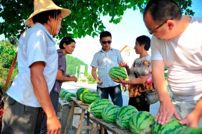 7月27日,几位路人正在选购西瓜。 恩施市三岔乡阳天坪村临近恩鹤(恩施至鹤峰)省道,当地村民利用交通优势,将种植的西瓜搬到路边售卖。时下天气炎热,价格便宜且品质较好的三岔西瓜深受欢迎,村民一天最多可销售近千斤。