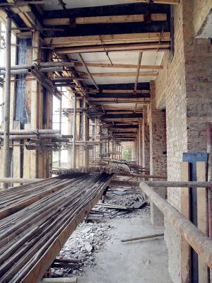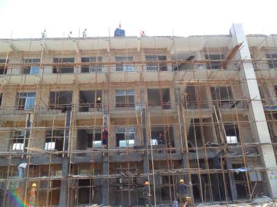7月28日,建筑工人们正在对宜昌市夷陵区分乡镇中心小学教学楼进行维修加固,使抗震设防类别达到6级。 宜昌市夷陵区分乡镇中心小学教学楼,兴建于20世纪90年代中期大规模普及九年义务教育时期,抗震设防烈度差。今年,上级财政投入资金160万元,通过对1840平方米的教学大楼的承重墙布钢精网加固、对走廊的挑粱加固和增加基础柱加固等措施,使教学楼抗震设防类别达到6级的要求,确保师生人身安全。(本报视界网 袁国悦 摄)