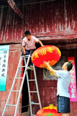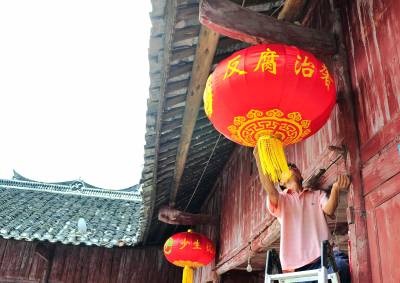 廉政宣传进村来 7月27日,恩施市新塘乡下坝村工作人员正在帮助村民悬挂廉政红灯笼。 该乡通过悬挂廉政红灯笼、张贴廉政宣传画册等方式在广大农村积极开展党风廉政建设和宣传教育。