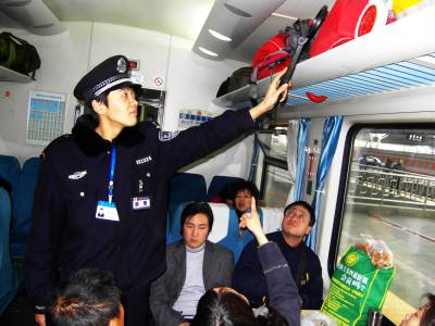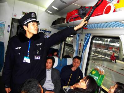 襄樊铁路公安处乘警支队进京K280、K50次列车乘警喜迎”两会”,精神饱满,身体力行,不放过列车每一个角落,安全做到零盲区,把易燃易爆物品、管制刀具、毒品等堵在站外车下。图为进京列车实习乘警申祖龙正在车厢内随机安检行李架物品。(罗超摄)附邮寄汇兑通讯联络方式:通联汇兑地址:湖北襄樊铁路公安处乘警支队罗超(收)邮政编码:441000电子邮件:luochao555@126.com电话:15327933301(警务通)QQ:274173791