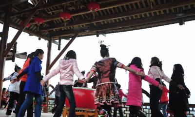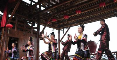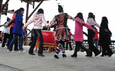 春暖花开时节,游客到恩施市芭蕉侗族乡枫香坡侗族风情寨采春茶、踏歌舞、吃农家饭,乡土风情让游人陶醉。