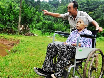 图为7月25日,黎孔鑫推着妻子江代兰在家门口看风景。本报视界网冉德强摄