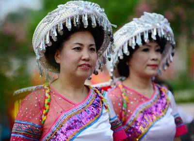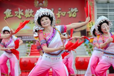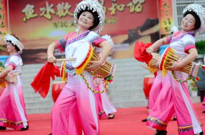 7月29日,恩施土家苗族自治州建始县老体协和谐艺术团土家族老姐妹们身着民族服饰盛装,背着土家背鼓,走进武警建始中队军营,为武警官兵击鼓起舞,,表演富有地方民族特色的《土家背鼓》。