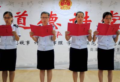 7月30日,南漳县国税局“道德讲堂”第五讲“孝老敬亲、传承美德”正式开课,国税干部参与观摩学习,接受道德洗礼。图为干部职工朗诵“道德经典”。通讯员 晏光辉/摄