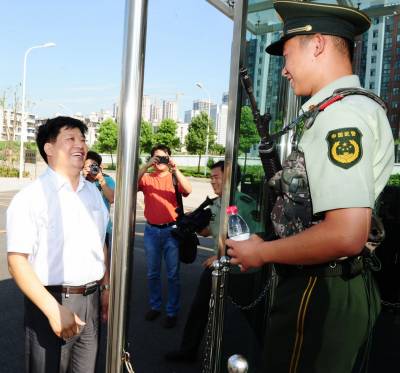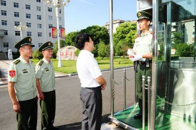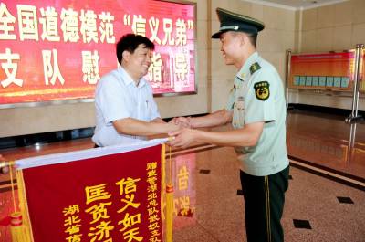 “八一”前夕(7月30日下午),湖北省信义兄弟农民工帮扶基金会董事长、全国道德模范孙东林来到武警武汉市支队看望慰问官兵,讲述信义兄弟先进事迹,给执勤战士送“清凉”,并赠送了一面写有“匡贫扶困子弟兵,信义兄弟传温暖”字样的锦旗。 本报视界网 邓志强 摄