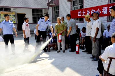 7月31日,在恩施市红土乡福利院里,全院院民和工作人员在公安干警的指导下进行灭火实战演练。