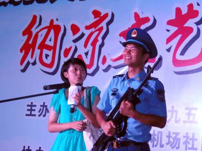 7月30日晚,解放军九五○○六部队与驻地的湖北省武汉市江汉区万松街机场社区、中信银行王家墩支行,联合主办了以弘扬双拥优良传统共建社区和谐家园为主题的欢庆“八一”纳凉文艺晚会。军民军嫂离退休老军干和小学生,同台表演了10余个反映新形势军民如水情的文艺节目,为纳凉消暑军民送上了丰盛的精神食粮晚宴。