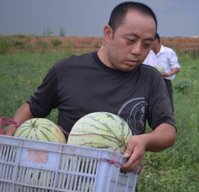 7月30日,安陆市棠棣镇个体老板李波(右一)在基地采摘优质西瓜(在苗木花卉基地查看苗木长势情况)。看好特色农业发展前景,李波投资近千万元,在该镇石河、董湾、轭头等村流转山地1000亩,建起樱花、楠木、白杉树、、紫薇、海棠、紫荆等苗木种植基地,在基地套种西瓜、花生等经济作物,打造四季有花看、四季有果摘,集观光、采摘、休闲、旅游、餐饮于一体的生态农庄。
