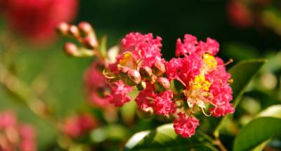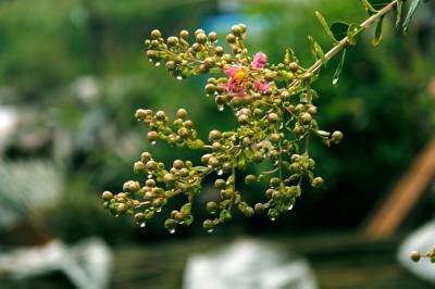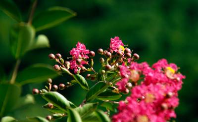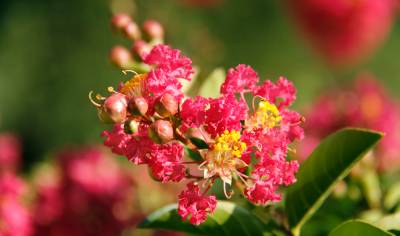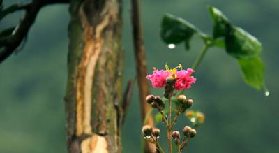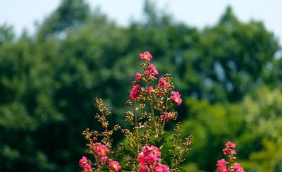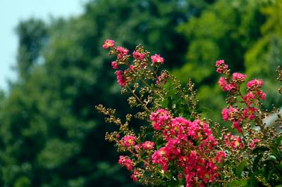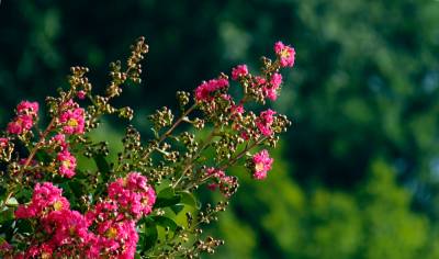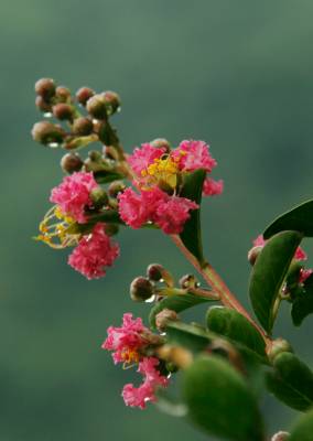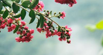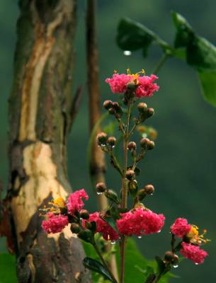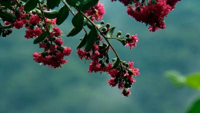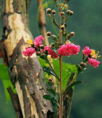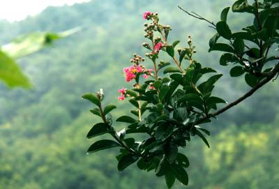 紫薇花又名满堂红、饱饭花、猴刺脱、五里香、佛相花,是一种被广泛种植的观花树种,紫薇原产中国,是一种适应性强的长寿树种。因其树型不高,所以非常适宜作为庭院观赏树和街道绿化树。形态:千屈菜科植物,落叶灌木或小乔木,高达7米,树冠不整齐,树皮光滑,淡褐色,嫩枝四棱;叶对生,椭圆形至柜圆形,长4—7厘米;圆锥花序顶生,花有红色、紫色、白色、水红色等多种花色,也名紫薇,茎3—5厘米。花期长,从6月到10月;蒴果近球型,茎约1.2厘米,果熟期10—11月。 紫薇属干屈菜科,人们俗称它“怕痒树”,是树木中一种奇特的树种。紫薇为花叶乔木,又名无皮树、满堂红、百日红。由于花期特长,6月至10月,花开不断,故名百日红。在竹溪县的各个乡镇到处可见各色的野生紫薇。