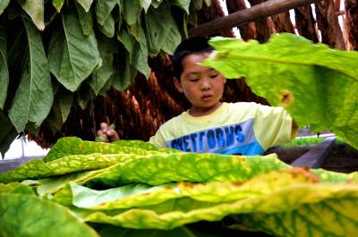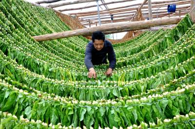 该村种烟大户李世银,今年他种了50亩白肋烟,现正是烟叶成熟的时节,今天他请了15个劳力在帮他采收、晾晒烟叶。