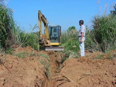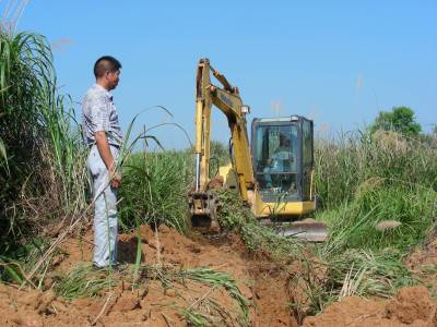 8日,黄梅县下新镇曹牌村组织钩机在开挖沟渠引水抗旱。7月中旬以来的持续高温干旱天气致使该村850亩中稻田严重受旱。面对严重旱情,该村投资60多万元新挖沟渠近2000米,并铺设地下管网,引湖水进行抗旱自救,力争将大旱带来的损失降到最低。(本报视界网 吴志雄 摄)