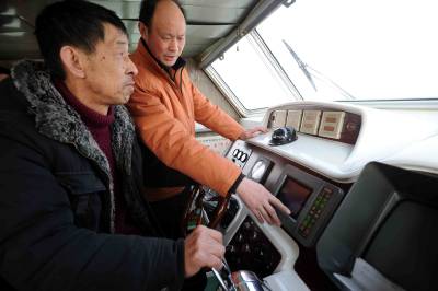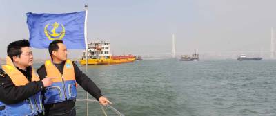 10日,海事官员正在指挥船舶通过浅窄的荆州太平口水道(图1)。至去年11月份以来,长江中下游持续低水位,而船舶通行量上升到每天300创余艘。荆州海事局先后对重点浅窄弯航道实行24小时现场监管,及时测量并向过往船舶通报航道水深(图2),同时实施单向控制通行,确保航道畅通,船舶航行安全。(记者杨平本报视界网徐涛摄)