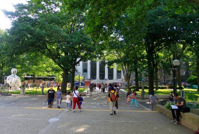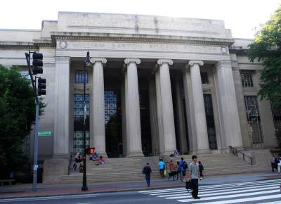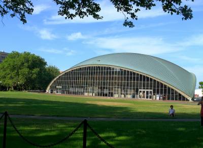麻省理工学院(MIT)也是美国一所综合性私立大学,享有“世界理工大学之最”的美名。经过近140年的发展,现已有学生近万名,并且已被世界公认为与牛津大学、剑桥大学、哈佛大学等老牌大学齐名的综合性的世界一流大学。导游说,过去,麻省也是可以进去参观的,因为一些中国游客大声喧哗,甚至有人随地小便,此后便禁止游客进入主校区。因此,我们只看到了图书馆、剧场、草坪等外围景观。据说进入麻省读书不容易,要顺利从麻省毕业也难,学生要修比其它大学多2—3倍的学分,曾有学生在卫生间抱着书睡着的事例。麻省学生也确实聪明,经常做一些令人匪夷所思的事。一次,他们居然在夜晚将消防车弄到了房顶上,老师怎么也想不出他们是怎么弄上去的。几个学计算机的学生竟然使波士顿的铁路系统全部瘫痪,被罚无偿工作三年。