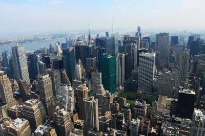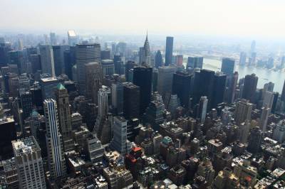 帝国大厦既是一座多功能的写字楼,同时也是纽约市最著名的旅游景点之一,成千上万的游客每天在这里排队等候电梯登顶观景。在86楼及102楼有观景台,游客可在观景台上360度地观赏纽约全景。我们参观完联合国总部后来到这里,排队先乘电梯到80层,在这里缓冲疏散一下人流,再排队乘电梯到86层,队伍弯弯曲曲绕大厅近一周。我们见前面的几个法国人跟工作人员说了几句话便从另一个入口走了进去,工作人员在用手示意并说着什么,我们也听不懂,只好紧紧跟随。原来他们觉得排队时间太长,自愿从旁边楼梯爬上第86层,我们也只有跟着爬6层楼梯。也好,又是一种不同的体验,工作人员好像也鼓励人们走上去。登顶后,和上海东方明珠、台湾101大厦感觉差不多,纽约全景尽收眼底。