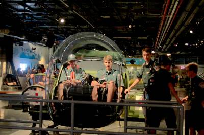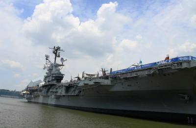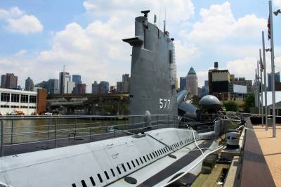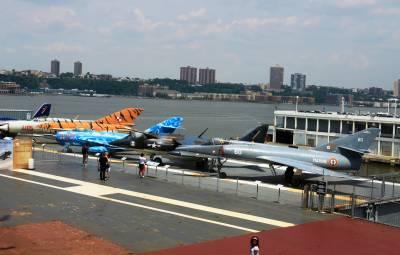 从帝国大厦出来,再去参观美国退役航空母舰“无畏号”。1974年3月15日,无畏号退役。最初,海军总部打算将无畏号拆解,但遭到民间反对。其中一房地产商兼慈善家筹集资金,购下无畏号将之改建为博物馆舰,后来有人又买下更多海军退役飞机、舰只赠送给此博物馆供游人观赏。这里平均每年有915,000人参观。舰艇一层甲板停有各种旧时战机,巨大舰舱内改为体验航海航空的游乐场,有从幼儿园到中学的孩子们在此游玩。二、三层则是当时海军官兵操作舰艇的驾驶舱、机舱和寝室,有一个军人在里面讲解。
