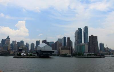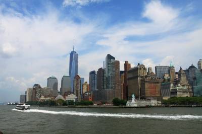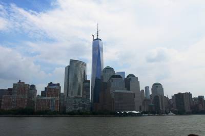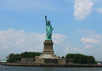 游船很大,可承载200人左右。游船一层基本都是空的,游客都集中在二层露天甲板上。太阳很耀眼,游船开动后,风呼呼地吹着,遮阳帽完全戴不稳。甲板上有座椅,起初大家都有秩序地坐着,当有著名景点出现时,部分游客向一方移动,导致游船发生倾斜。特别是一些中国人,只顾自己抢占有利地形,完全不顾别人的感受。游船全过程只有英语解说,好像没把我们华人放在眼里,感觉不太好,因而我们只有用眼看,凭感觉记忆揣测。风景确实美,纽约著名景点地标逐一呈现,异常壮观。特别是自由女神像,宽阔的河面上,自由女神举着象征“自由照耀世界”的火炬屹立于蓝天之下的自由岛上,使人产生无限遐想。游船会缓慢调转船头,让所有乘客都有近距离观赏自由女神像的机会。