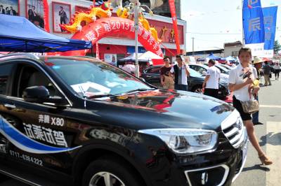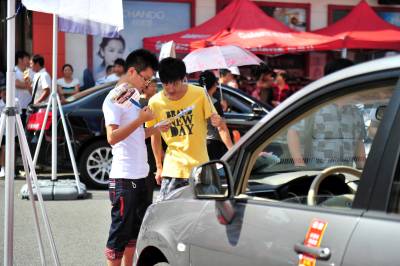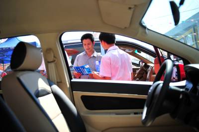 2013年8月8日,三峡坝区移民群众在宜昌市夷陵区乐天溪镇文化节车展活动现场了解新车情况。当日,宜昌市“2013首届乡镇惠民巡回车展”在三峡坝区“门户”——夷陵区乐天溪镇举办的文化节上盛大开幕。宜昌各汽车销售商将品牌展车开到乡镇百姓家门口,并以不同形式打折让利促销,为打算购车的乡镇消费者提供更多选择。在首次乡镇车展活动现场,20多款惹眼的新车吸引当地移民群众争相咨询选购。 本报视界网 张国荣 摄