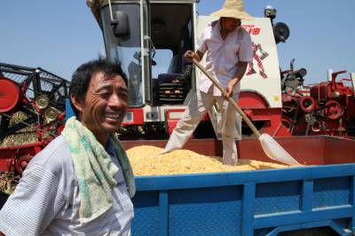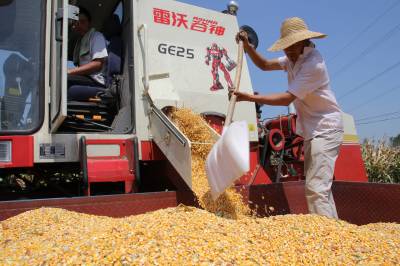 8月7日,汉川市马鞍乡白湖村村民黄随兴正在用收割机收割玉米。机收玉米不仅省时,省力,而且秸杆即时切割、粉碎、还田,既环保又增加了土地肥力。