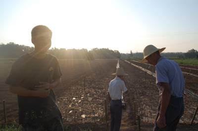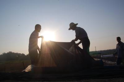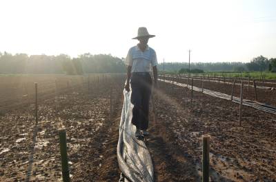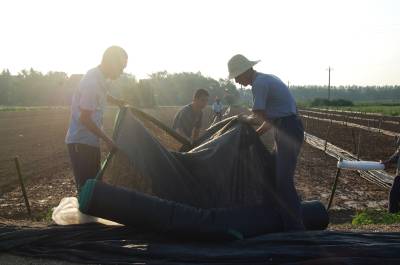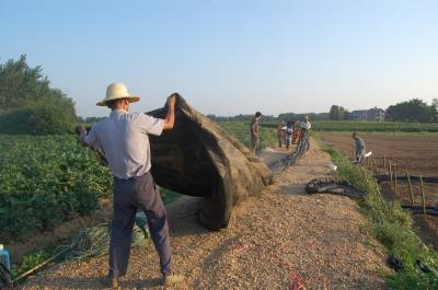 8月8日清晨,云梦县清明河乡桂花村王兴家庭农场组织劳力为花菜苗圃遮阳保苗。云梦县是湖北省蔬菜生产大县,近来持续高温干旱,广大菜农采取机械抽水浇灌、铺设遮阳网等措施,保苗护苗,保证蔬菜正常生长,确保鲜菜供应市场不断季。视界网 陈保忠 摄