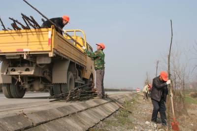 天门打造生态景观路3月10日,天门市公路局赖场养护站养路工人在天仙一级公路沿线植树。连日来,天门市党政领导干部和群众2000多人,在全市公路沿线参加义务植树,使公路成为一道道”路在林中展、车在景中行、人在画中游”的美丽风景线。(本报视界网刘银斌摄)