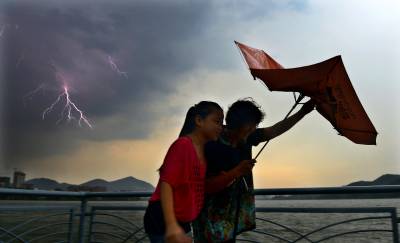 磁湖边一市民与女孩在暴雨闪电中前行,暴风雨吹翻了她们的雨伞。