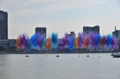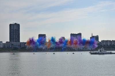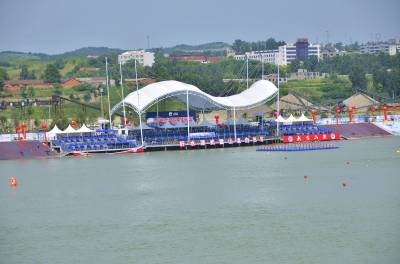 此次丹江口大奖赛赛场设置上,融合了丹江口山水特征和文化底蕴,在右侧的运动员围场区开辟了太极广场,精心设计太极八卦水上赛道,为比赛增添了挑战和观赏性。赛场设置在沧浪州生态湿地公园,背靠丹江口大坝,无论赛场环境,还是观赏视角,都非常理想。开幕式上的武当武术表演和祈福仪式都蔚为壮观。