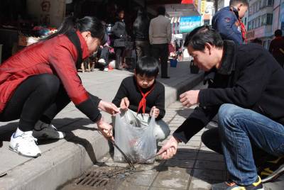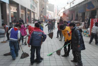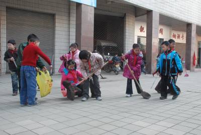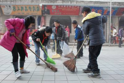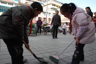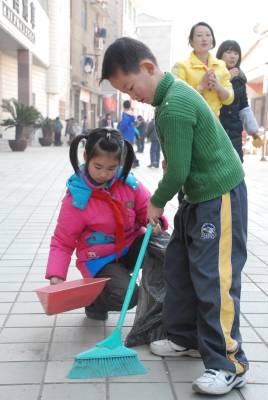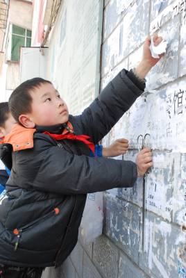 学雷锋、树新风,少先队员在行动。3月11日,五峰土家族自治县实验小学数百名少先队员走上街头,他们手拿扫帚、铁锹,清扫街道垃圾、清除牛皮癣广告,争当环保小卫士。孩子们的行动让不少市民加入到清除垃圾的队伍中来。(本报通讯员肖永奎摄)