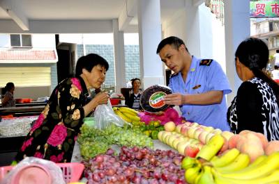 8月9日,在恩施市红土乡新落成的农贸市场里,工商部门工作人员正在教经销户识货物真假。