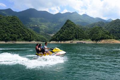 8月10日,游客正在恩施市屯堡乡坎家村“水上人家”农家乐体验摩托艇带来的乐趣。据农家乐老板介绍,近期以来,这家主打水上游乐的农家乐平均每天能接待游客200人次,双休日游客更是达到500人次。连日来,我省气温居高不下,酷热的天气带热了避暑旅游项目,游客们纷纷来到高山、森林以及水边寻求夏日清凉。(视界网签约摄影师 黎袁媛 摄)