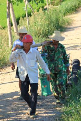 汉川市回龙镇杨占村受近期持续一个多月的高温无雨,农田受旱严重。面对旱情,杨占村不等不靠,通过村民自筹、社会支助筹资6.2万余元购置抗旱机械在军垦河打坝架机提水抗旱,并疏洗沟渠1400米,保证了该村2500亩农田用水需求。(图为村民安装抗旱设备)